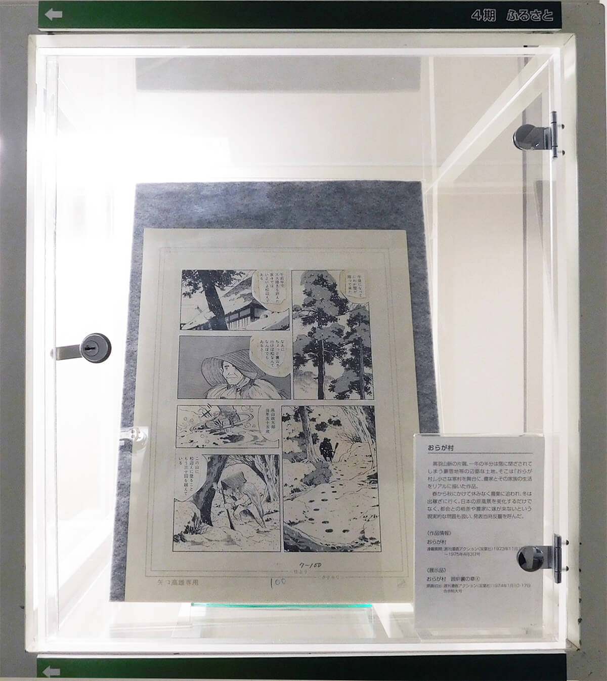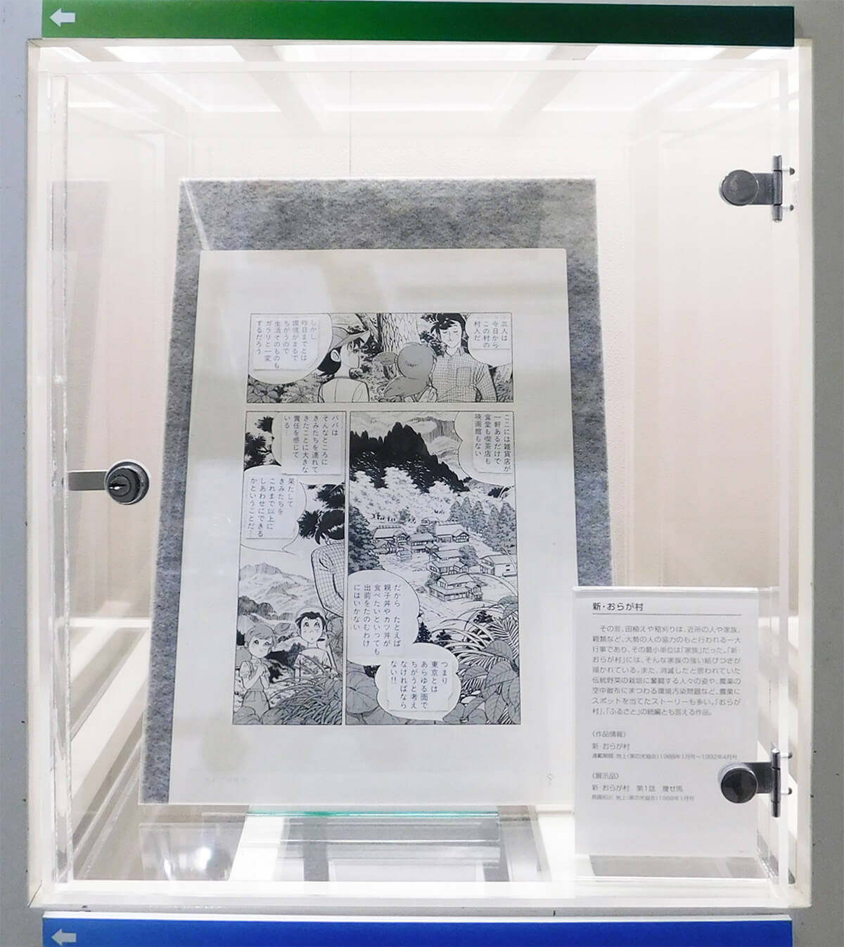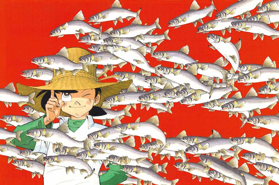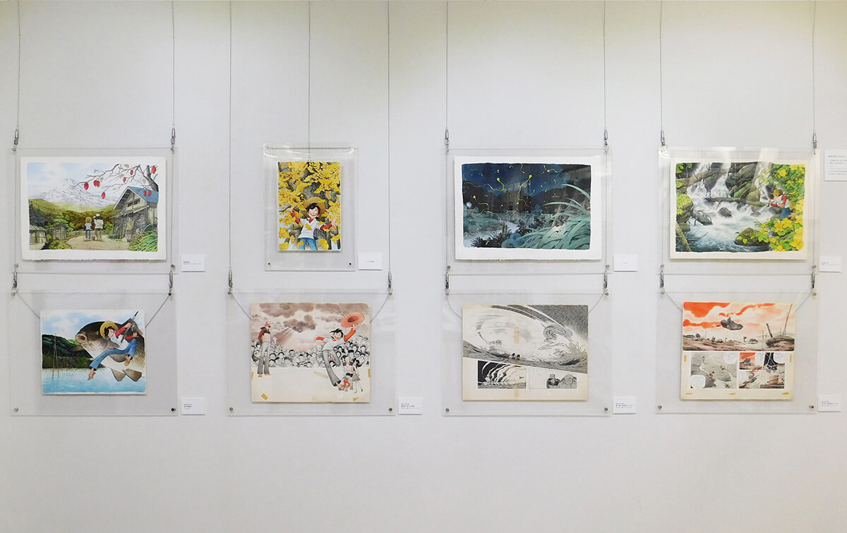 会期を4期に分け展示します。会場正面壁には、四季折々の日本の情景を描いた美しいイラストや、「釣りキチ三平」をはじめとする代表作の迫力ある見開きページを展示します。